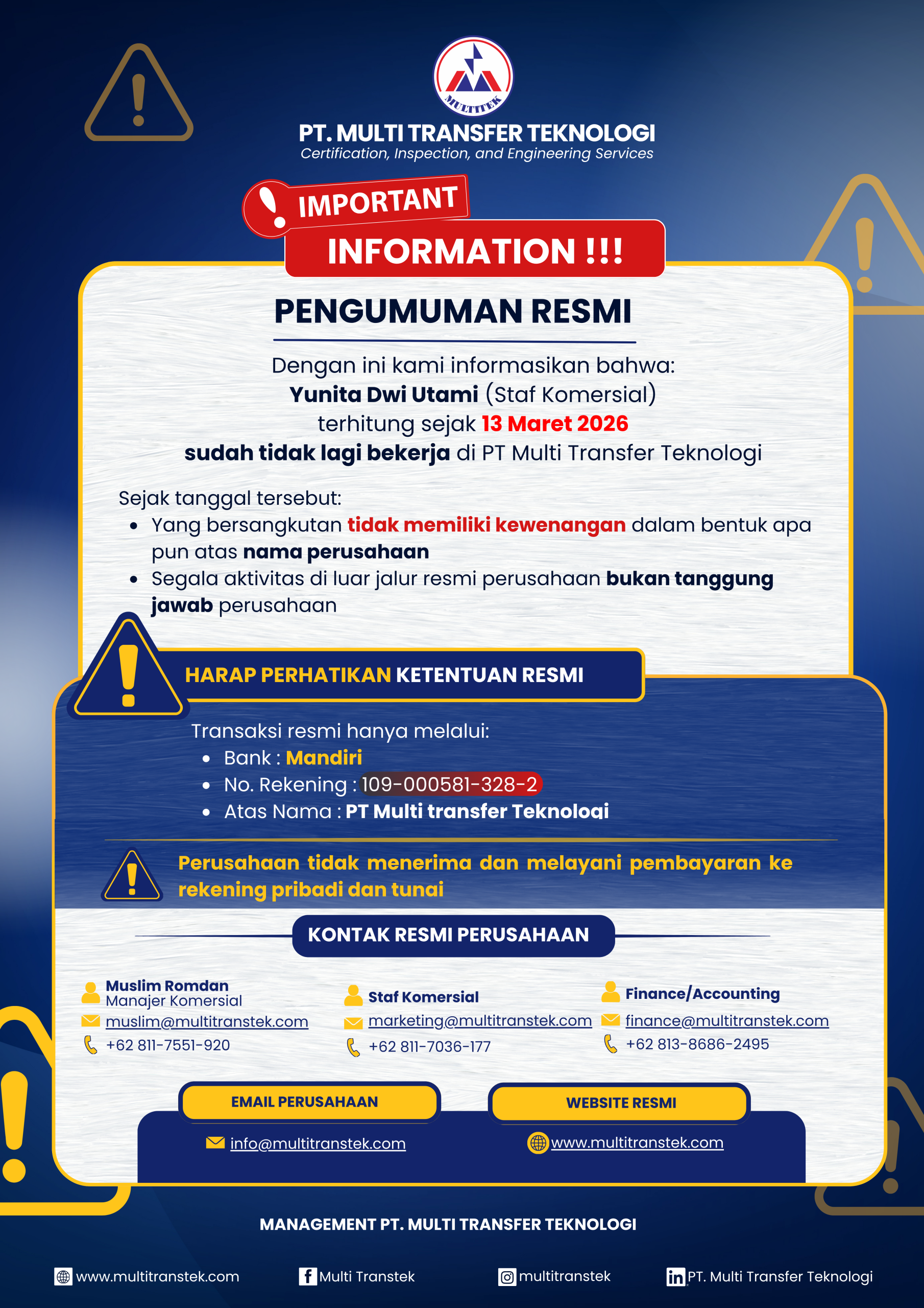 MULTITEK hadir untuk memberikan jasa demi menjaga mutu peralatan guna menunjang pengendalian sistem manajemen kelayakan dan ijin pemakaian sesuai dengan peraturan Kementerian Tenaga Kerja Republik Indonesia melalui pemeriksaan dokumen terkait, pemeriksaan fisik, pengujian fungsi dan sertifikasi atas peralatan dan mesin untuk mendapatkan sertifikasi kelayakan dan ijin pemakaian dari Instansi Pemerintahan terkait.